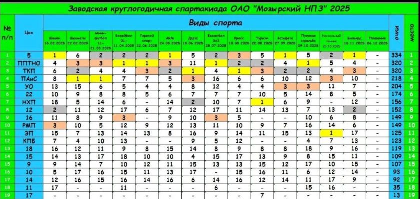 РЕЗУЛЬТАТЫ ЗАВОДСКОЙ ЕЖЕГОДНОЙ СПАРТАКИАДЫ-2025 СРЕДИ ЦЕХОВ И ПРОИЗВОДСТВ ОАО «МОЗЫРСКИЙ НПЗ»